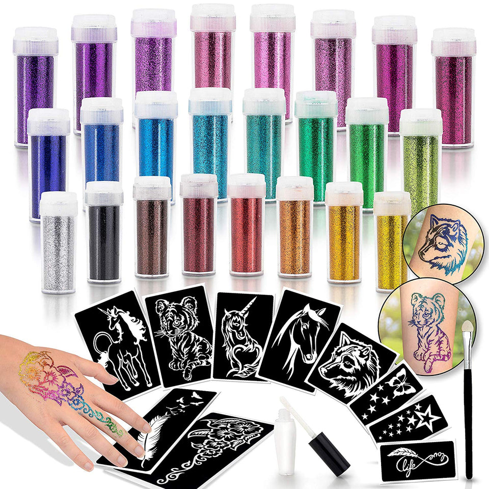 Glitter Tattoo Set New Glitter Tattoo Kit 24 Large Glitter Tubes And 160 Stencils Temporary Flash Tattoos For Children Teenagers And Adults Festivals Parties Games Diy Decorations Amazon De Toys
